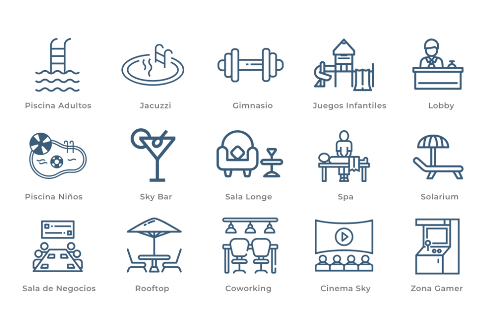 Con innovadores espacios tales como: Imponente Rooftop, Sky bar, Helipuerto , Área de Juegos, Gimnasio, Salón Bbq, Coworking, entre otros, pensados para una estancia exclusiva y llena de confort, que además aumentan el atractivo del edificio para los turistas.